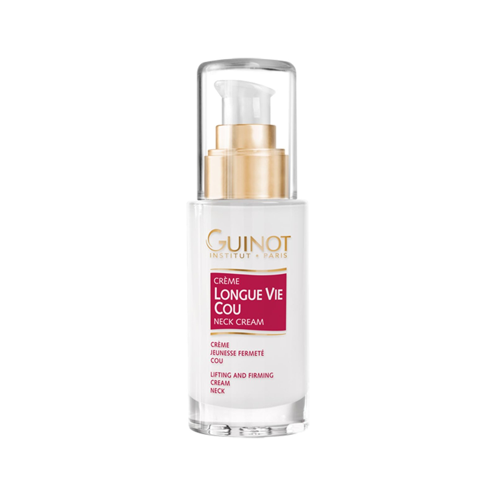 The skin in this area is subject to more stretching and pulling due to head movements – up and down, rotational, etc. – which, in addition to natural ageing, result in premature wear of elastic fibres, loss of firmness and the appearance of wrinkles. GUINOT has created a cream with a high concentration of firming and regenerating active ingredients to help reduce visible signs of ageing in the neck area.